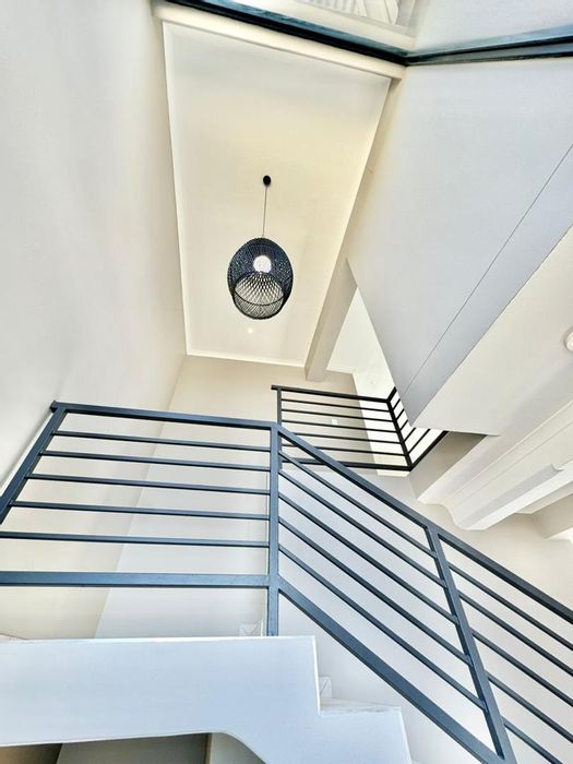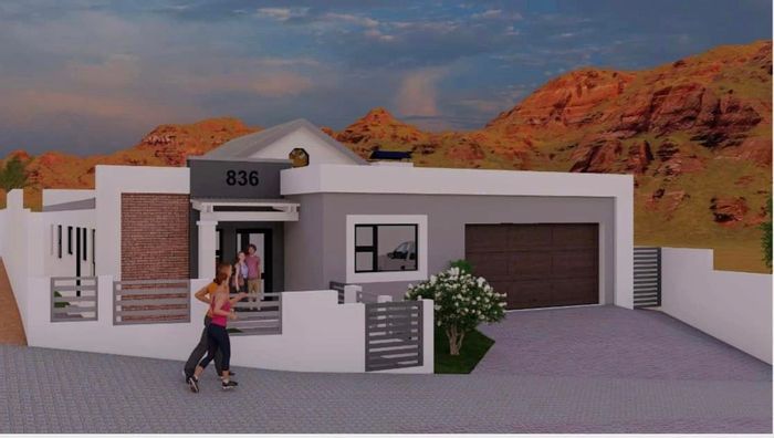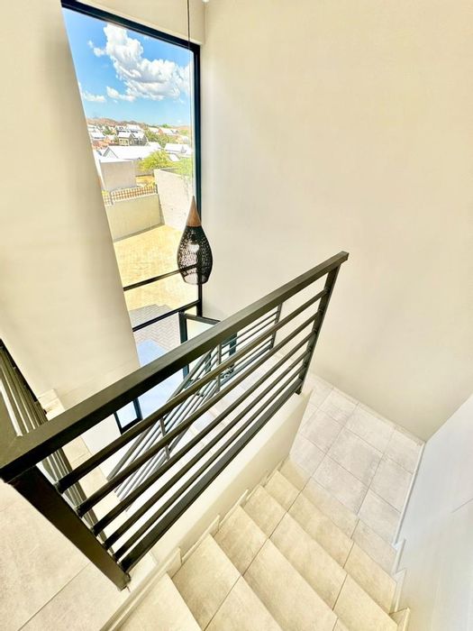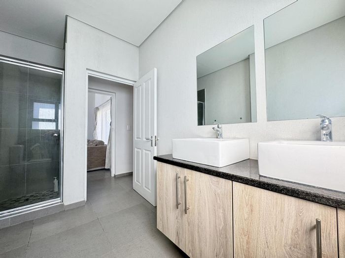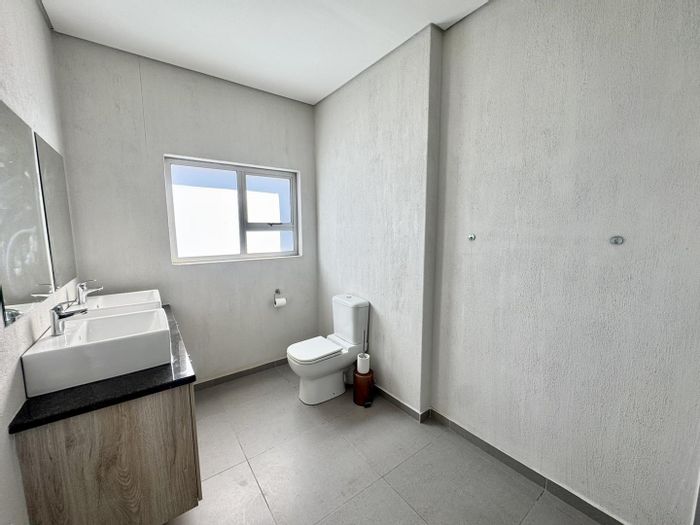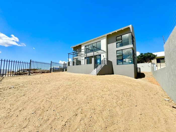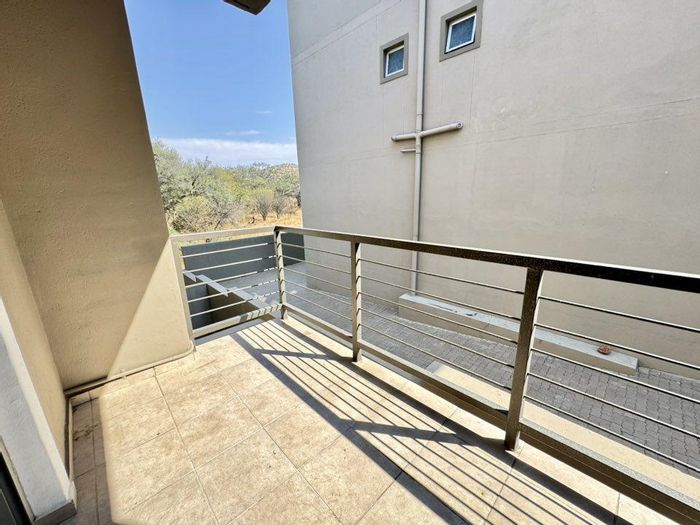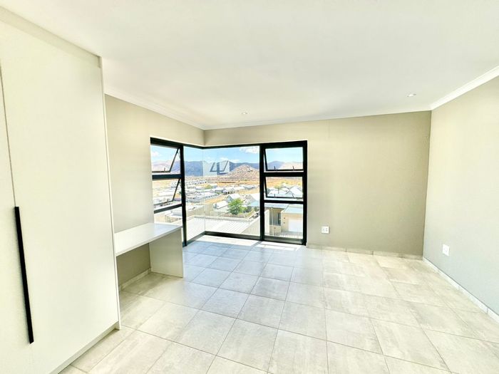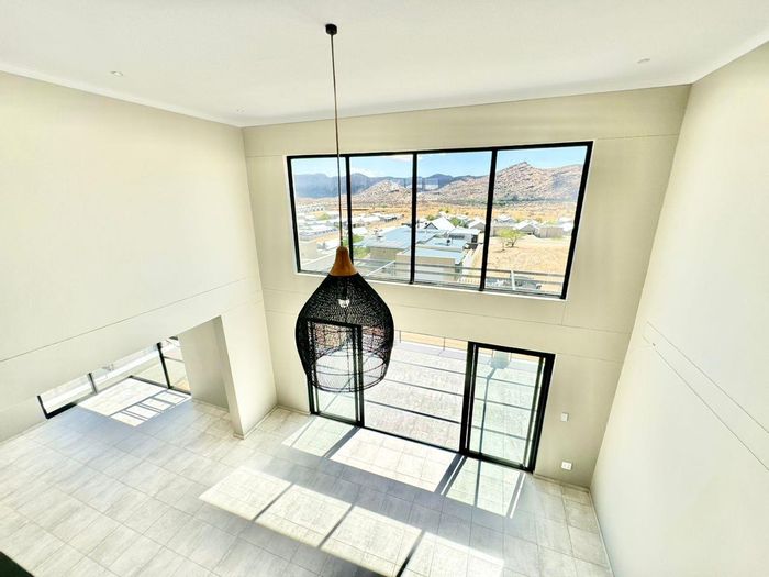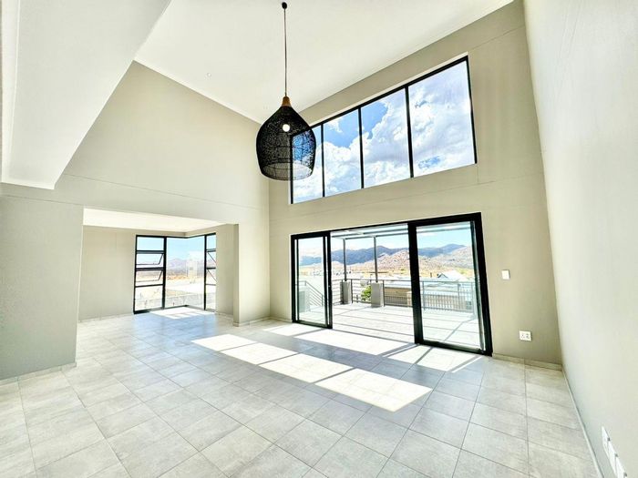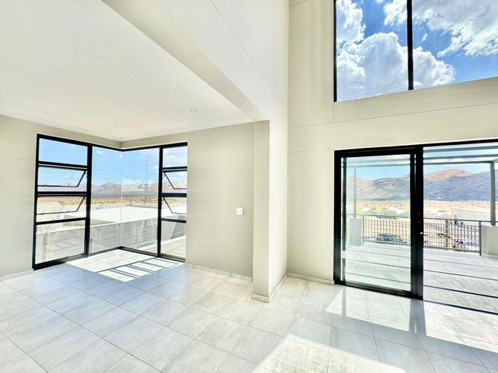 Relax on a balcony with panoramic views in secure Elisenheim Lifestyle Estate, Windhoek, with double-volume living, open-plan kitchen and covered veranda with braai. Three bedrooms, two bathrooms, double garage.