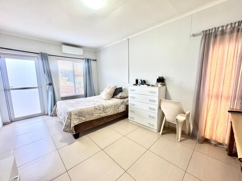 - The main bedroom features an air conditioner, an en-suite bathroom, and a private door leading to a paved courtyard.