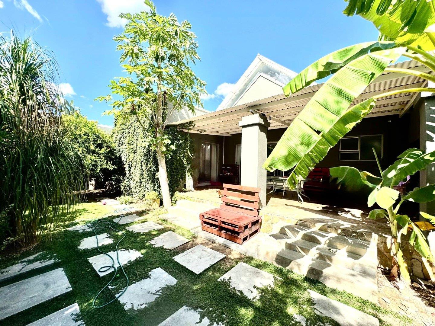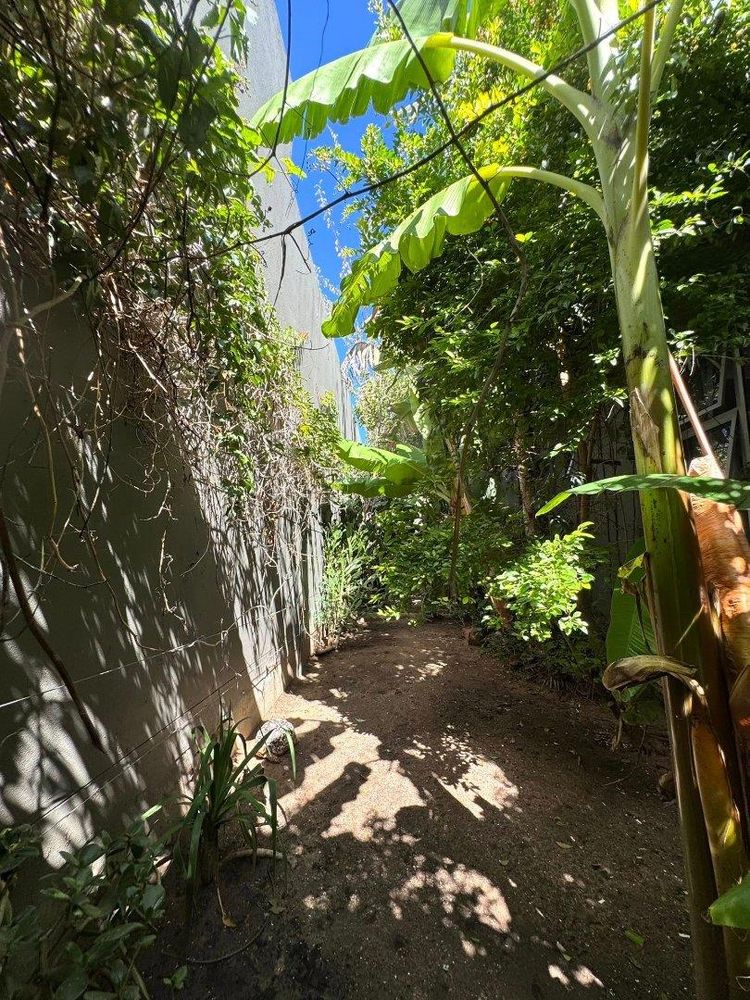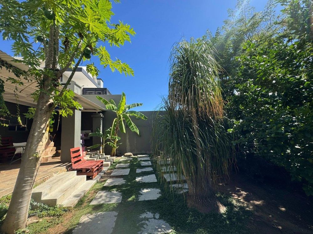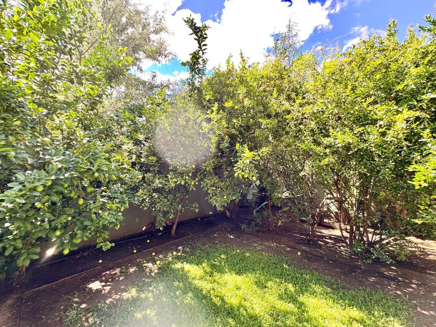 “A lush, established garden featuring numerous lemon trees, granadilla vines, banana trees, pomegranate, and paw-paw trees, surrounded by a well-maintained green lawn. The garden creates a peaceful, productive oasis filled with mature fruit trees and plenty of space to relax and enjoy nature.”