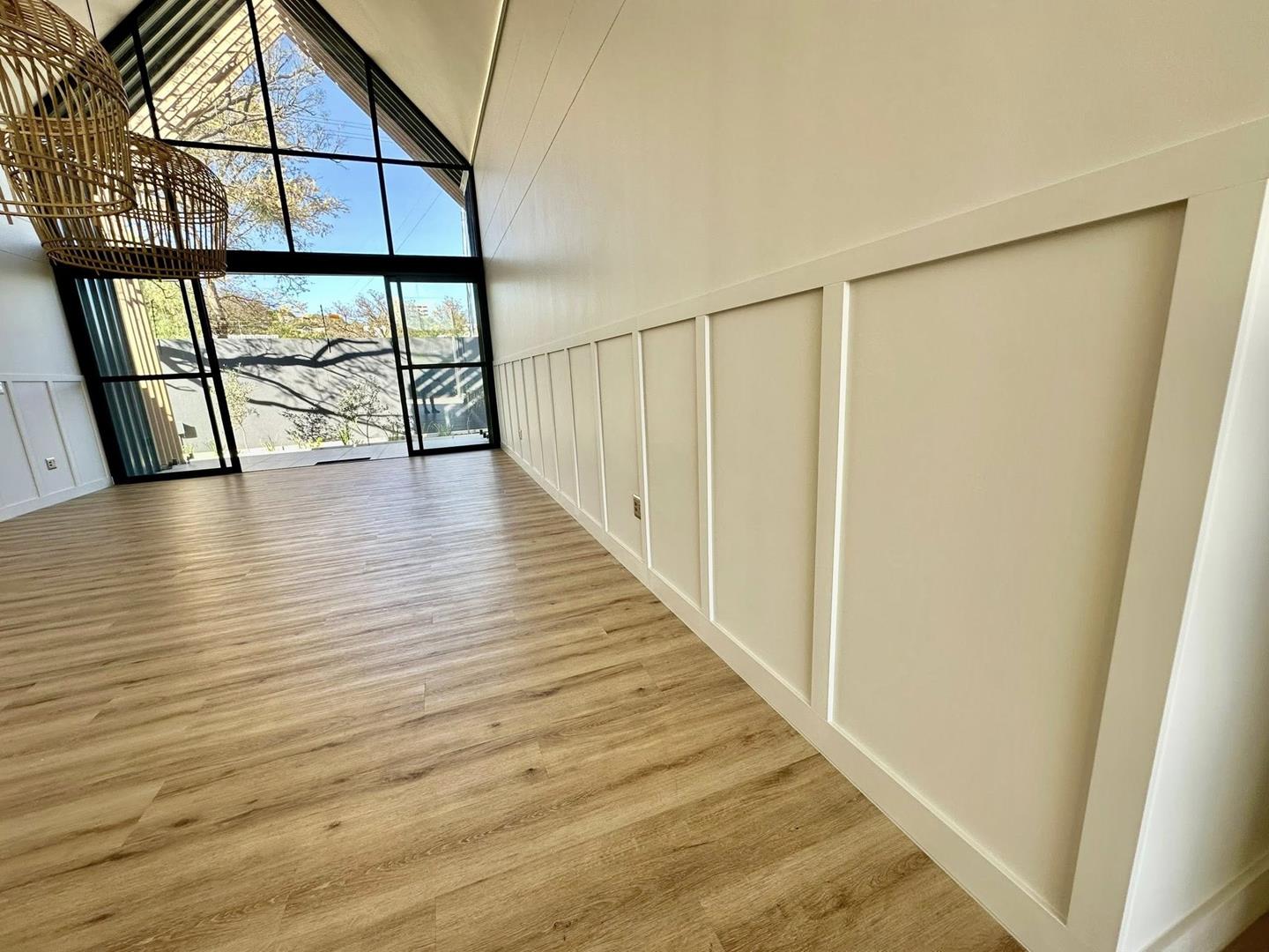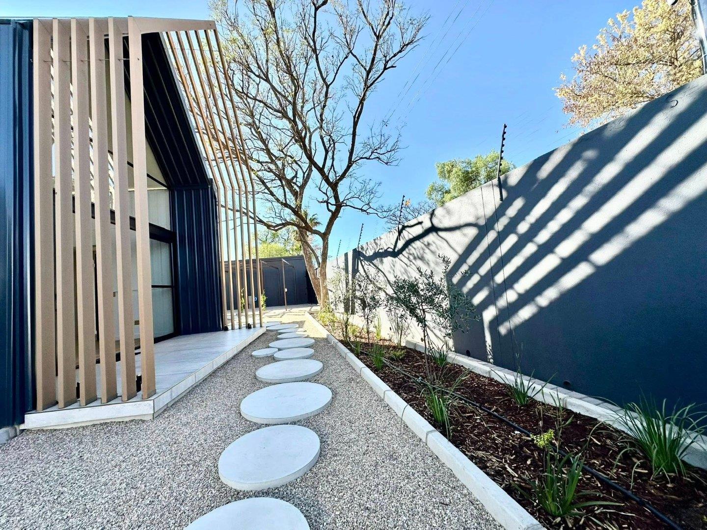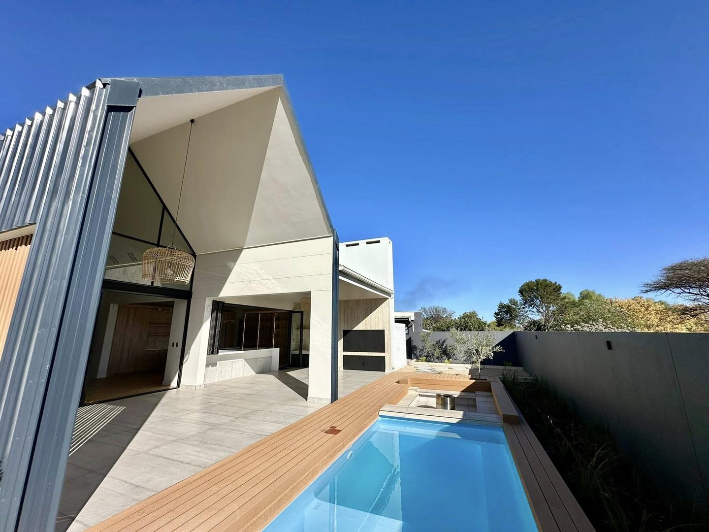 This area overlooks the pool, fire pit and a fabulous newly established garden where creepers are already making their way up to the sky.