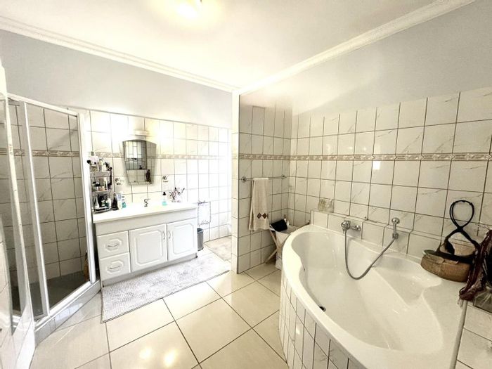 Family-focused entertaining in Eros, Windhoek — expansive patio with indoor BBQ, heated pool and treehouse-filled garden for kids; four bedrooms, four bathrooms and four garages.