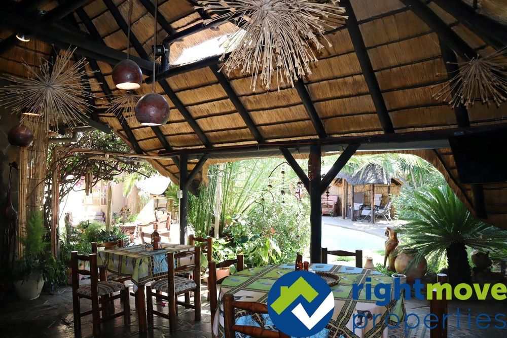 The thatched bar area is attached to the main building with a bar counter and a thatched roof on a timber structure.