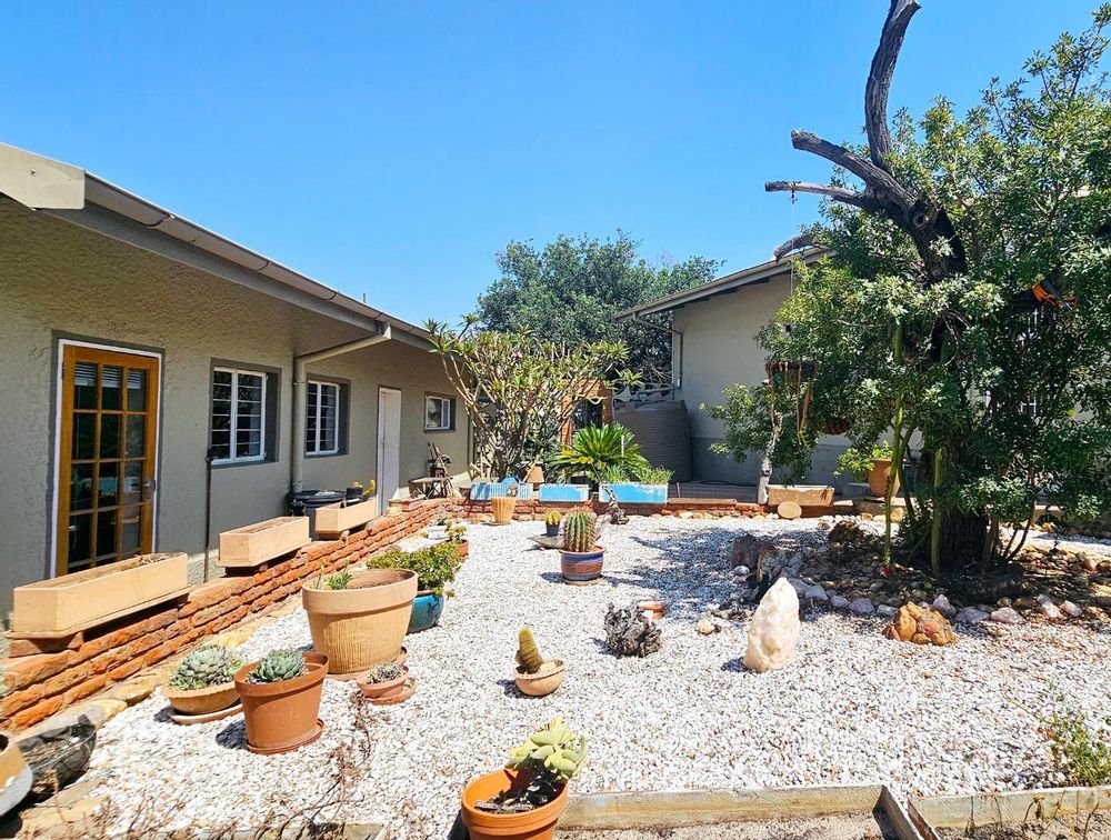 The natural water-wise garden creates a visual appealing outdoor space with an abundance of hardy, succulent plants and large trees.