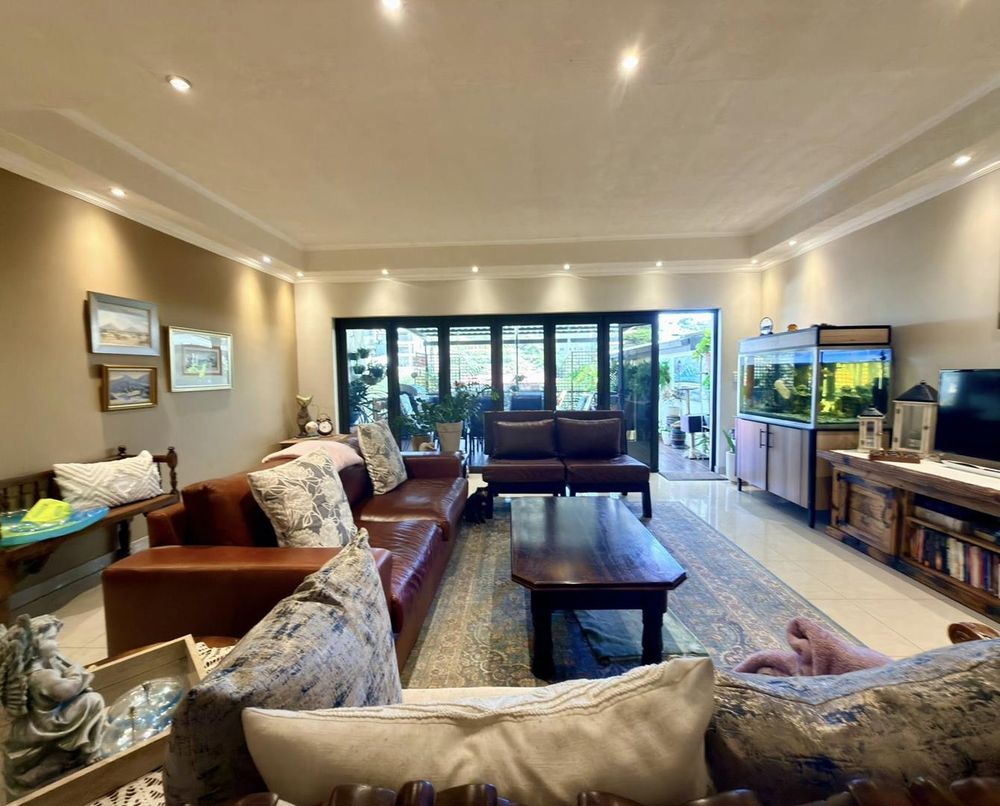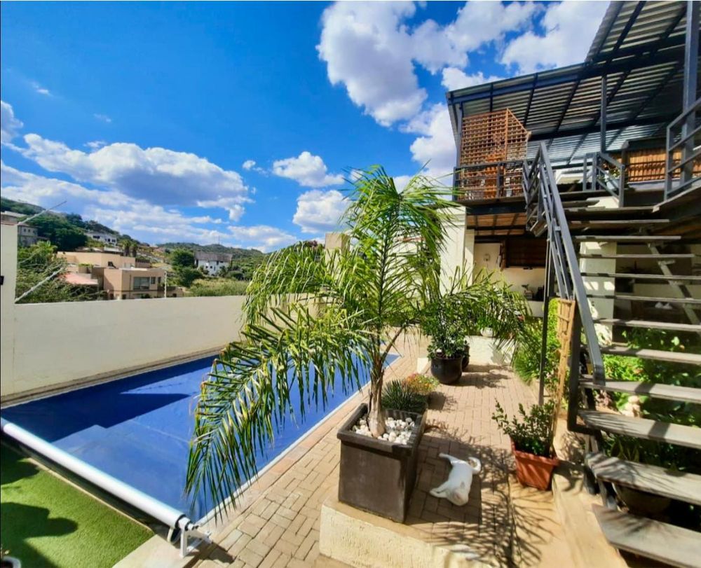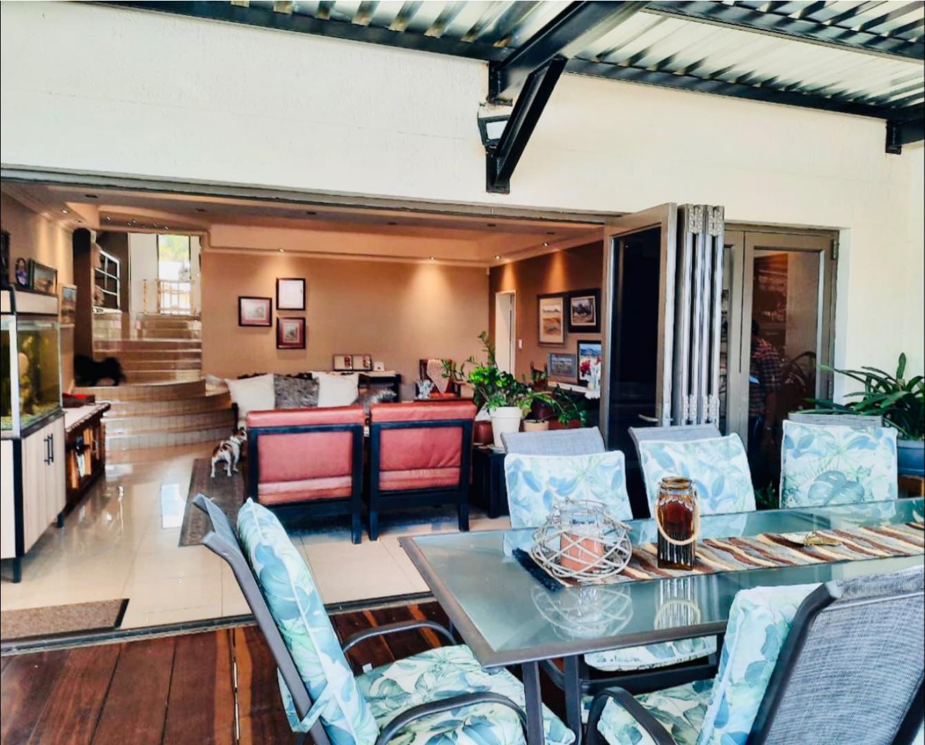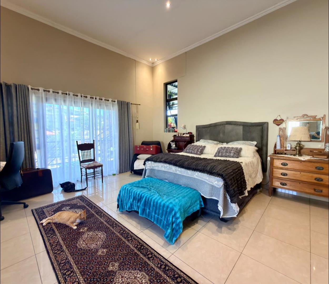 Step out from the lounge onto a large wooden deck with stunning views, ideal for relaxing sundowners with family & friends. Stairs lead to a beautiful garden with another entertainment area, braai area, two pools - a small one that is shallow and the other one being very deep.
