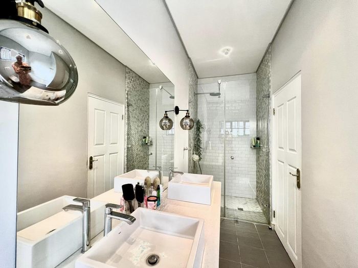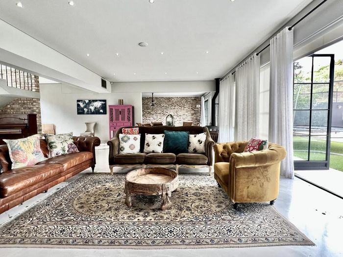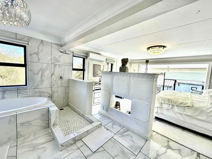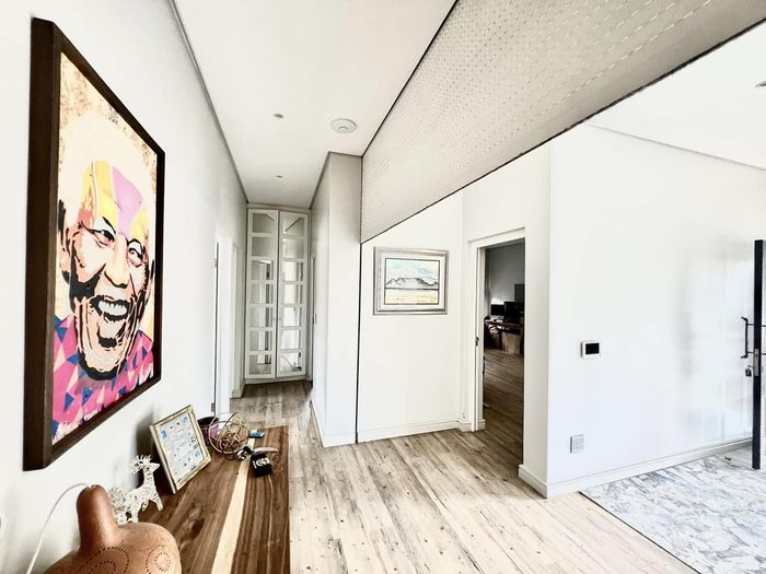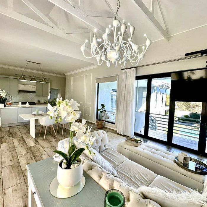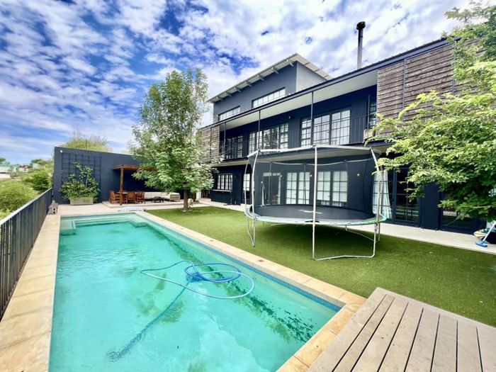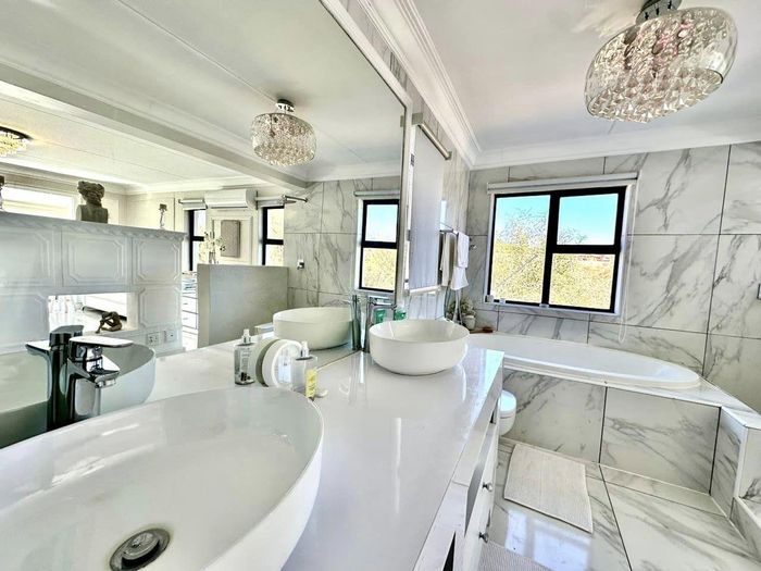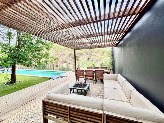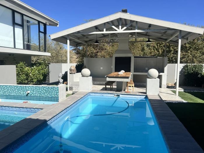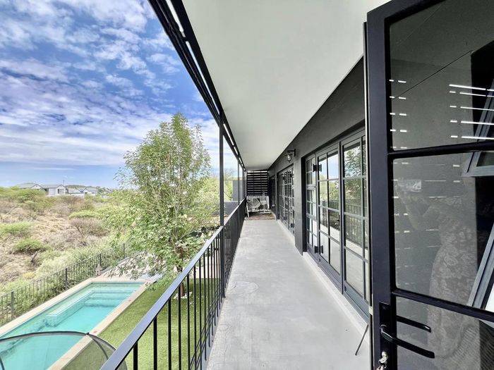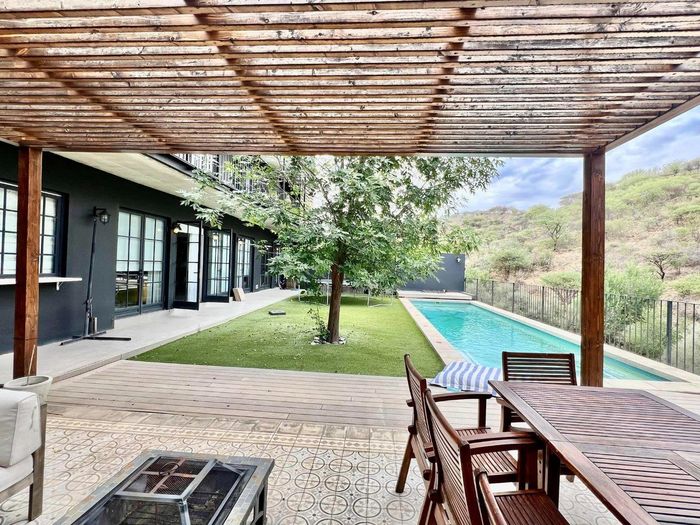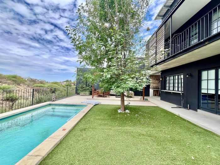 Entertainer's oasis with panoramic Windhoek views and seamless indoor-outdoor flow, featuring a striking blue kitchen, heated training pool and pergola — four bedrooms, four baths, double garage.
