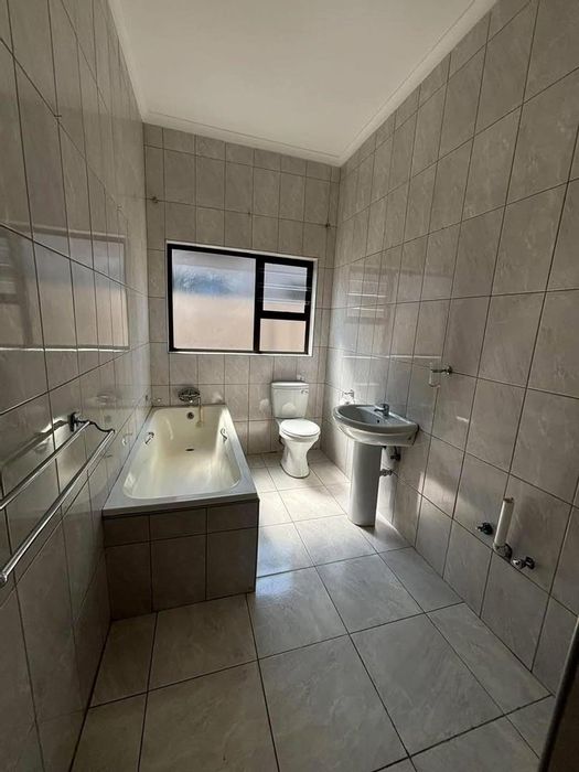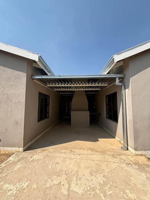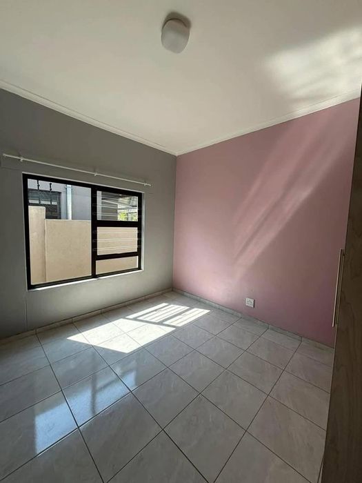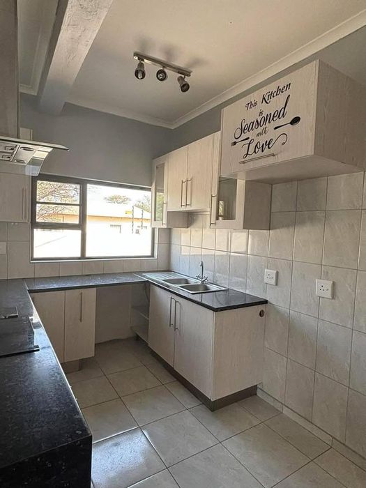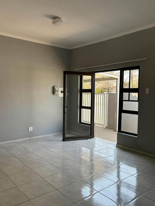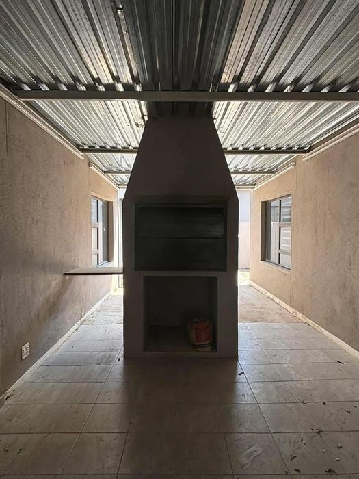 Relax in a secure, quiet Okahandja complex with open-plan living flowing to a covered porch and built-in BBQ — pet-friendly townhouse with three bedrooms, two bathrooms, and double covered parking.